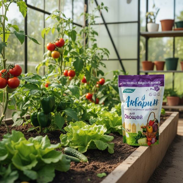 Акварин Для овощей — водорастворимое удобрение, в состав которого входит азот, фосфор, калий, магний, сера и микроэлементы – железо, цинк, марганец, медь в хелатной форме, а бор и молибден – в минеральной. Благодаря кислой реакции (рН) удобрения, оно легко растворяется в холодной воде и более эффективно усваивается корневой системой или листовой поверхностью растений.