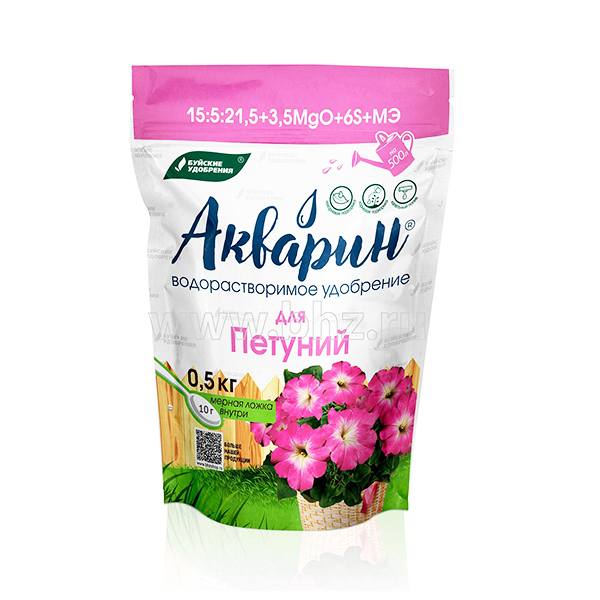 «Акварин» для петуний — водорастворимое удобрение, в состав которого входит азот, фосфор, калий, магний, сера и микроэлементы – железо, цинк, марганец, медь в хелатной форме, а бор и молибден – в минеральной. Благодаря кислой реакции (рН) удобрения, оно легко растворяется в холодной воде и более эффективно усваивается корневой системой или листовой поверхностью растений.