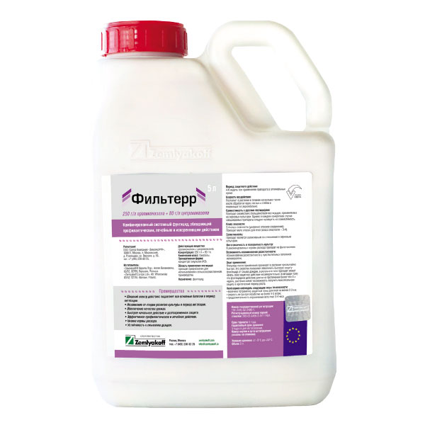Фильтерр – это системный фунгицид, предназначен для защиты зерновых колосовых культур от мучнистой росы, видов ржавчин, пятнистостей листьев, болезней колоса; сахарной свеклы – от церкоспороза, мучнистой росы. Фунгицид обладает профилактическим, лечебным и искореняющим действием.