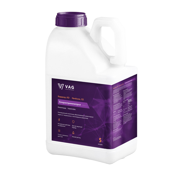Основное действие инсектицида Хардкор происходит при поступлении внутрь насекомых, а также через кутикулу (кишечно-контактное действие). Перераспределение в растении происходит за счет трансламинарного передвижения хлорантранилипрола через клетки эпидермиса стебля и — по проводящим сосудам ксилемы, что способствует попаданию действующего вещества в новый прирост.