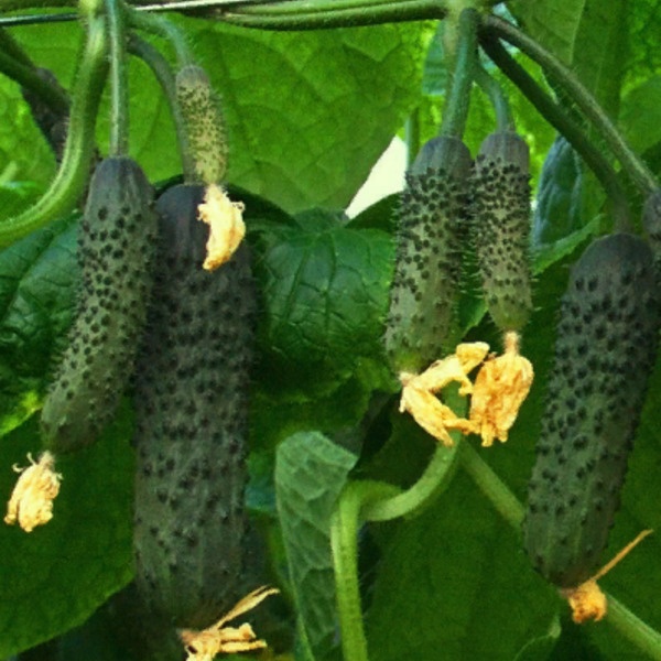 - Окраска плодов темно-зеленая, без рисунка, при высокой солнечной инсоляции, а также на грунтах с высоким Ес практически черная, поверхность крупнобугорчатая (в жару бугорки не разглаживаются). Окраска шипов белая;