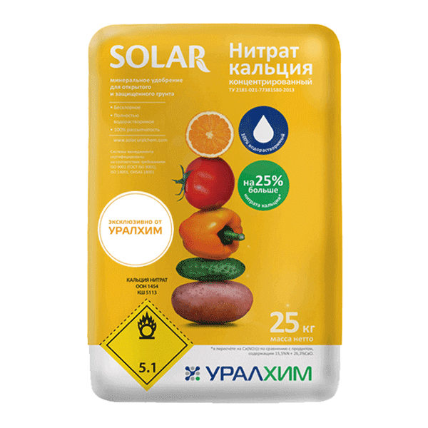 Кальций регулирует поступление питательных веществ в растение, играет ключевую роль в формировании клеточных стенок и мембран. Применение нитрата кальция способствует повышению устойчивости растений к стрессовым факторам среды, улучшает качество плодов и увеличивает срок их хранения. Наличие кальция в доступной форме необходимо в течение всей вегетации, т.к. данный элемент не перераспределяется внутри растений. Кальциевая селитра – отличное решение для кислых почв.