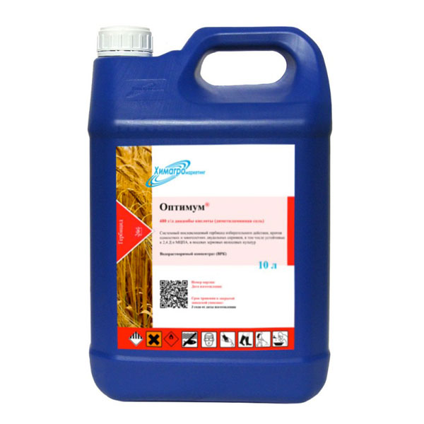 - Оптимум — классический гербицид для защиты зерновых, которая очищает поле от однолетних и многолетних корнеотпрысковых сорняков под следующие культуры в севообороте.
