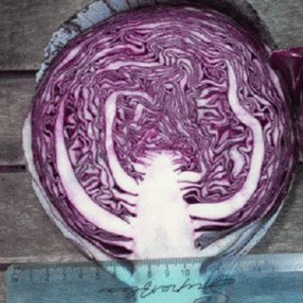 - Кочан овальный, частично покрытый, плотный, на разрезе фиолетовый.
