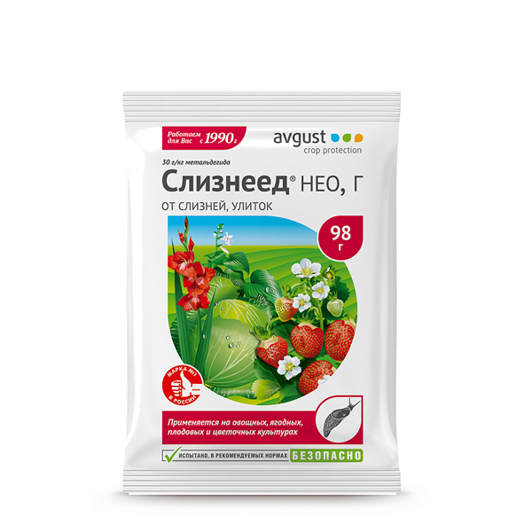 Современный препарат от слизней и улиток на овощных, плодовых, ягодных, цитрусовых, цветочно-декоративных культурах и винограде. Препарат попадает в организм вредителей двумя способами: через кожные покровы после контакта с гранулами и непосредственно с пищей. «Слизнеед НЕО» провоцирует обезвоживание организма слизняков и улиток, что приводит к их дальнейшей гибели.