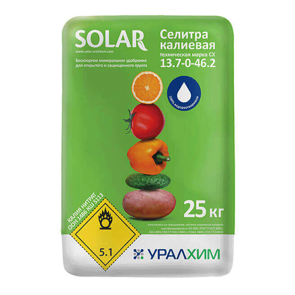Высокоэффективное азотно-калийное водорастворимое удобрение с повышенным содержанием калия. Калиевая селитра под брендом SOLAR идеальна для применения в защищенном грунте, системах фертигации, а также для внекорневых подкормок зерновых, технических, плодовых и декоративных культур.