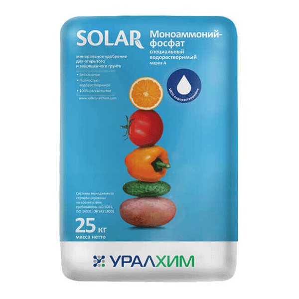 Благодаря 100% растворимости в воде, МАФ под брендом SOLAR является отличным источником азота и фосфора в доступной форме для растений. Применение моноаммонийфосфата особенно эффективно на ранних стадиях развития растений, в период формирования корневой системы.