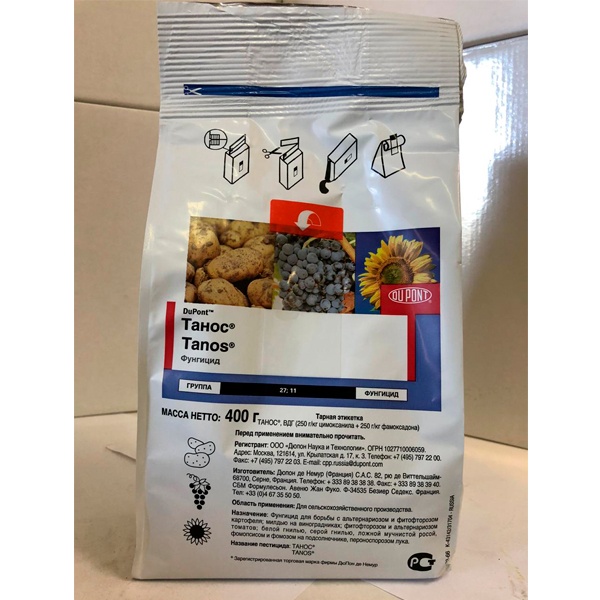 ФАМОКСАДОН Контактный компонент Танос прочно связывается с кутикулой и сохраняется в восковом слое листьев. При попадании на поверхность листа, обработанную Танос, зооспоры гибнут в течение 6 секунд. ЦИМОКСАНИЛ Локально-системный компонент Танос быстро проникает внутрь листьев и оказывает профилактическое, защитное и лечебное действие. Цимоксанил останавливает развитие болезни благодаря капсулированию инфицированных клеток растения.