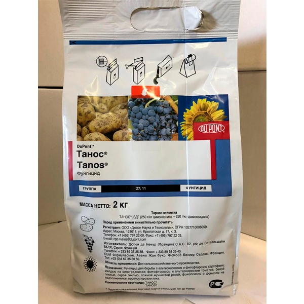 ФАМОКСАДОН Контактный компонент Танос прочно связывается с кутикулой и сохраняется в восковом слое листьев. При попадании на поверхность листа, обработанную Танос, зооспоры гибнут в течение 6 секунд. ЦИМОКСАНИЛ Локально-системный компонент Танос быстро проникает внутрь листьев и оказывает профилактическое, защитное и лечебное действие. Цимоксанил останавливает развитие болезни благодаря капсулированию инфицированных клеток растения.