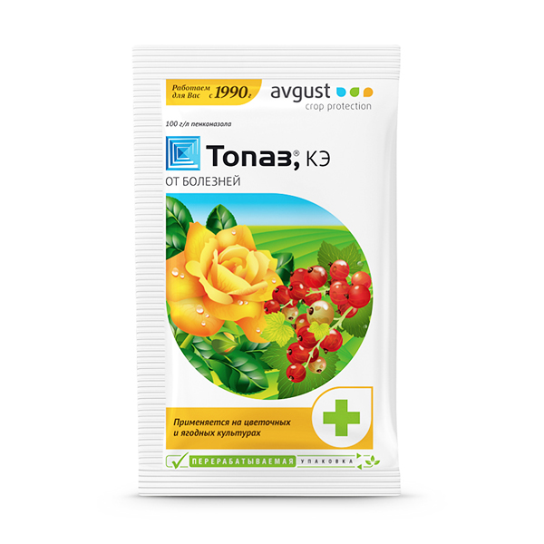 Средство отличается высокой скоростью действия – останавливает рост мицелия уже через 2–3 часа после обработки. Оно проникает внутрь растений, за счет чего защищает не только листву и стебли, но и молодые побеги даже в неблагоприятных погодных условиях. Препарат «Топаз» обеспечивает длительный эффект на протяжении не менее 10–14 дней.