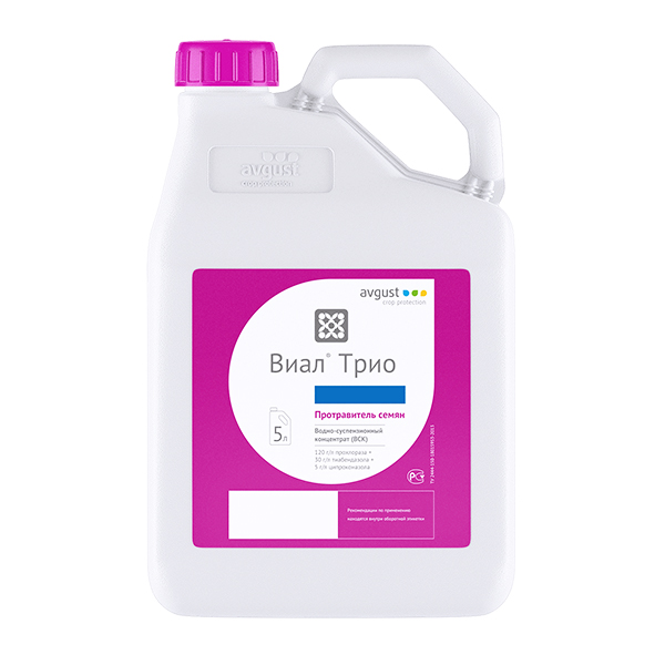 Прохлораз ингибирует биосинтез клеточных стенок грибов путем торможения образования фермента деметилазы. Проникает в обработанные семена неглубоко, благодаря чему высокоэффективен против возбудителей, находящихся на поверхности и в верхних покровах семян. Прохлораз обеспечивает высокий уровень фунгицидной активности против корневых гнилей и церкоспореллеза. За счет высокой почвенной стабильности защищает озимые от снежной плесени. Благодаря этой комбинации активных компонентов Виал Трио идеально подходит для применения в современных технологиях производства зерна с использованием минимальной и «нулевой» обработки почвы, а также в севооборотах с насыщением зерновыми культурами более 50 % и высоким инфекционным фоном.